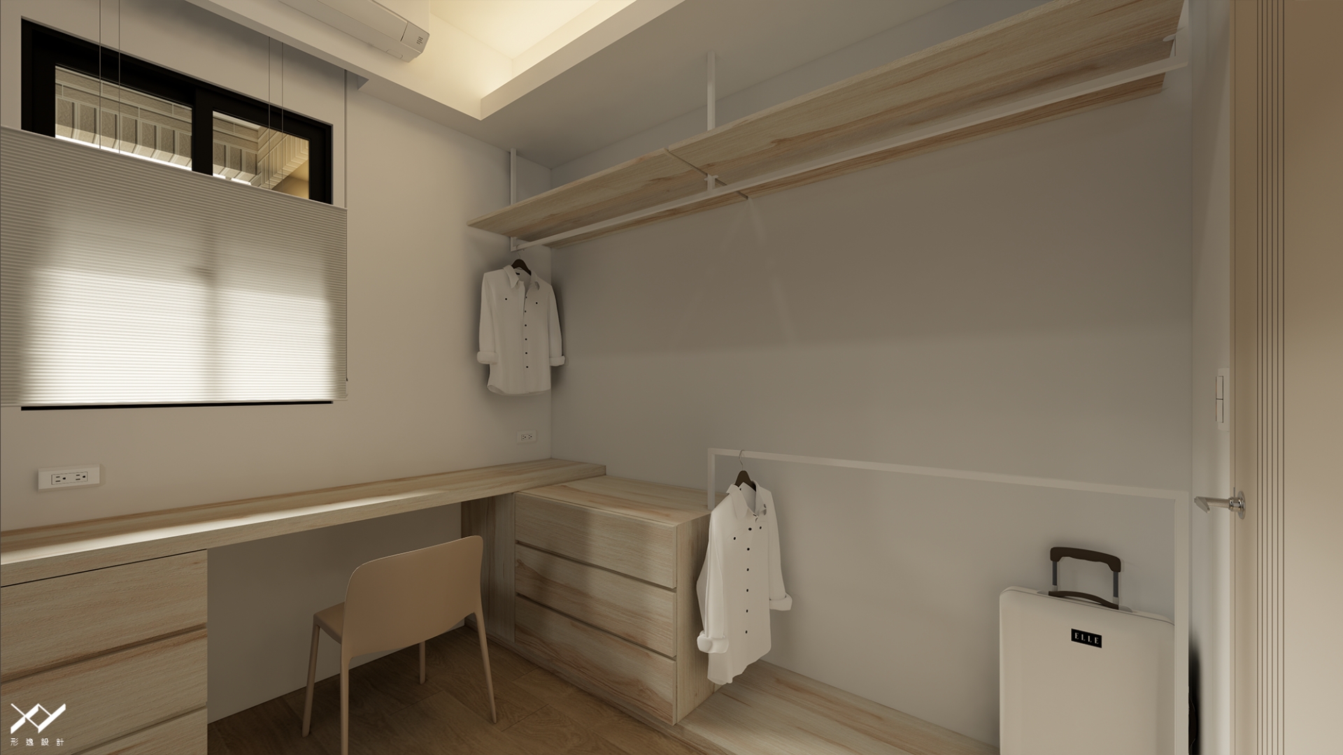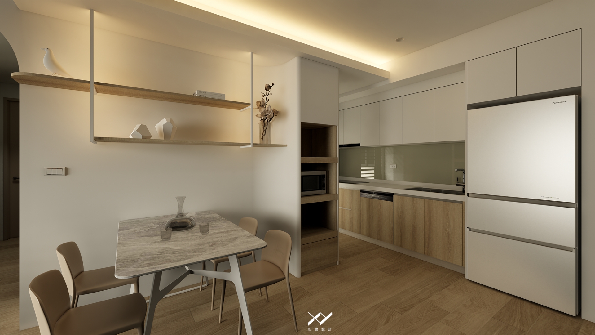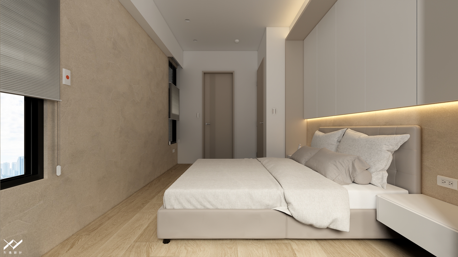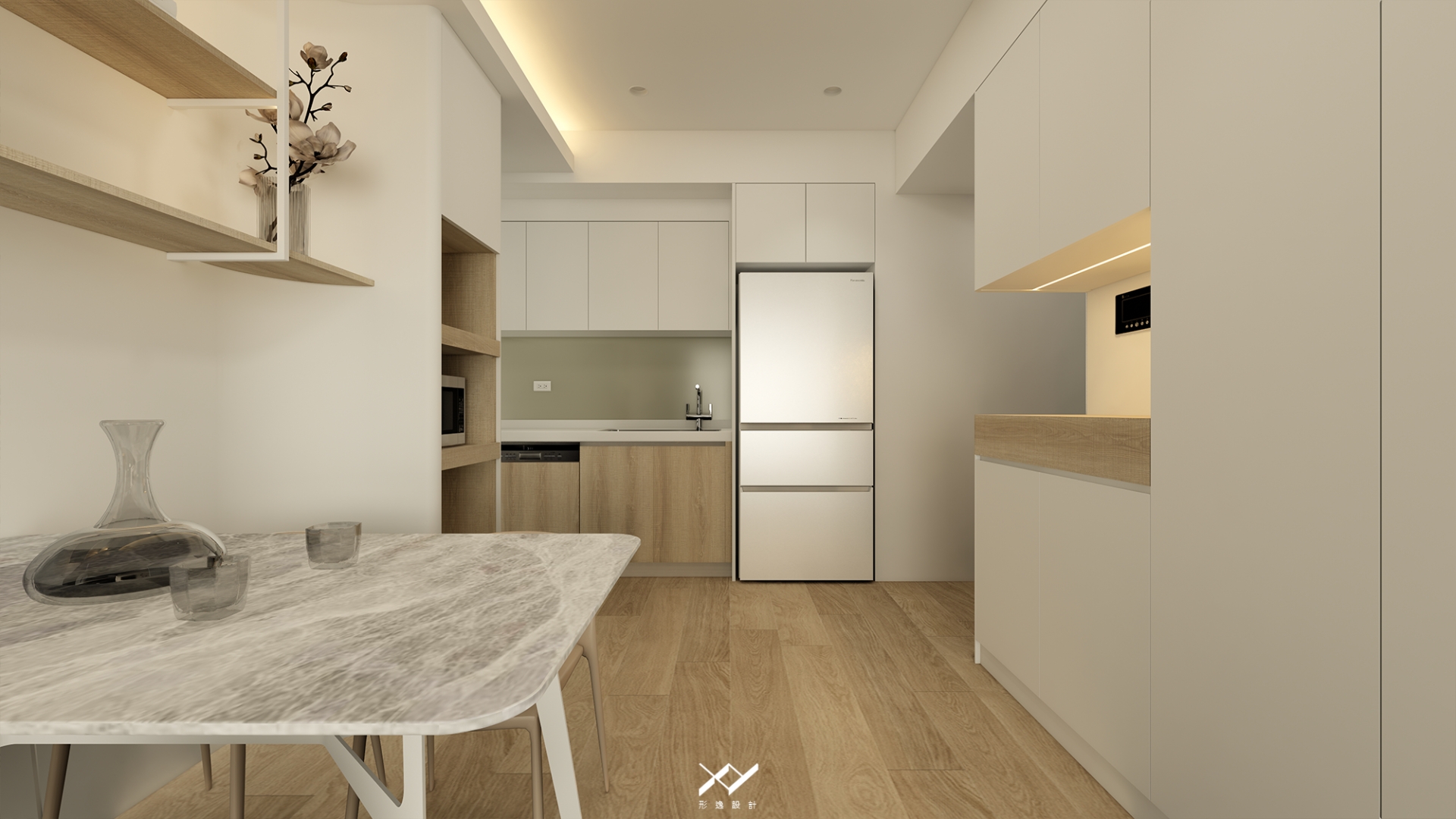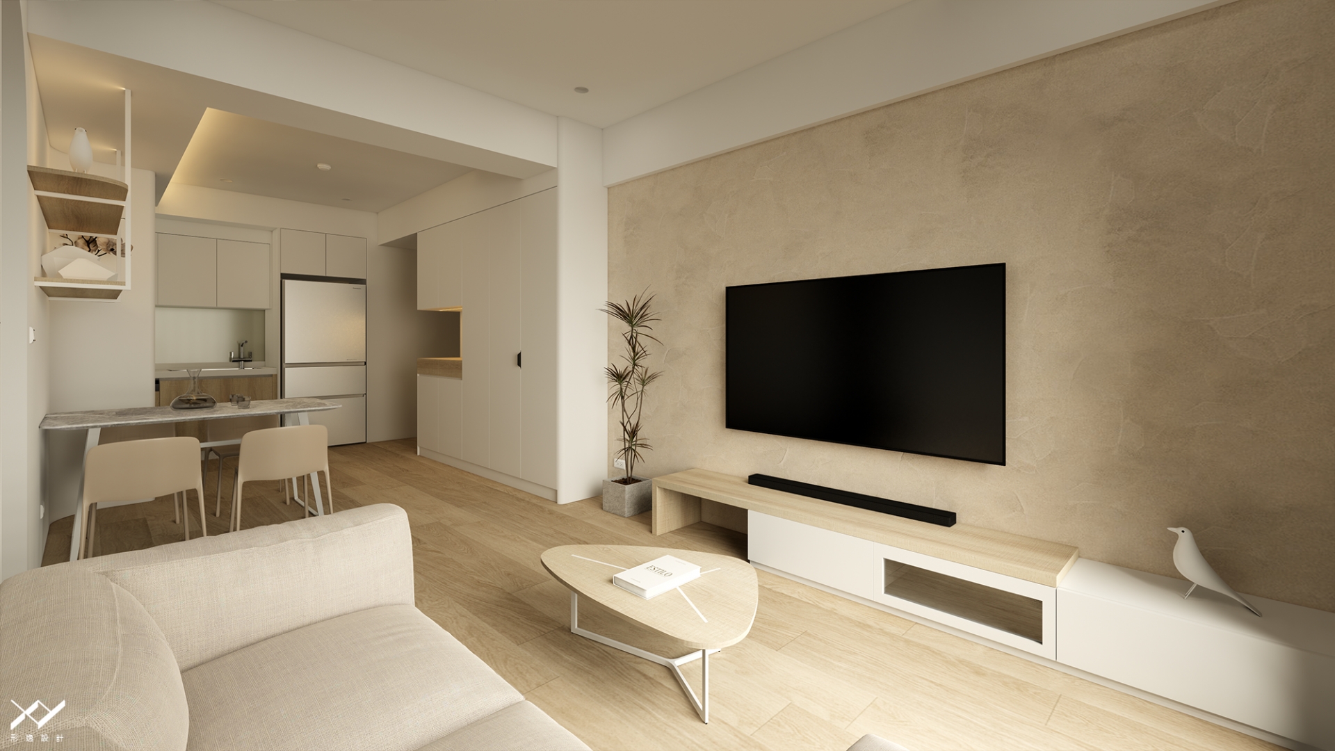 採用簡約柔和的線條設計,沒有複雜的造型,搭配中性色調,以白色.淺木皮色為主,再將空間適當留白,讓視覺上更開闊舒適,